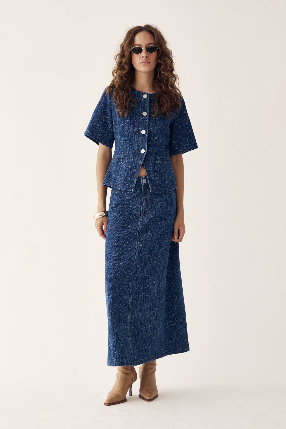 Kasaundra Blazer is a short-sleeved denim blazer with front slanted pockets and a tailored fit. Style Kasaundra Blazer with Lyndall Skirt for a complete and coordinated look.