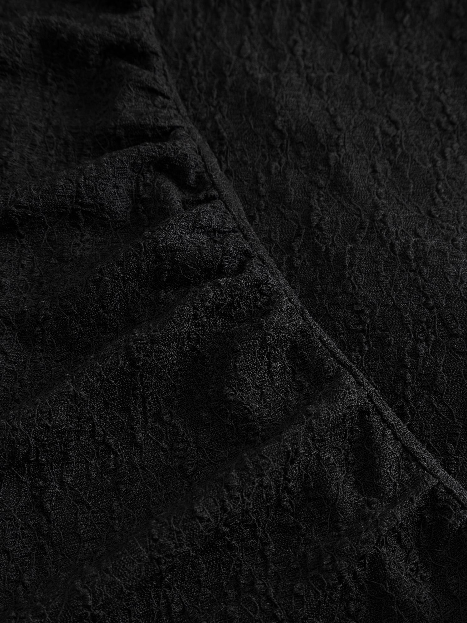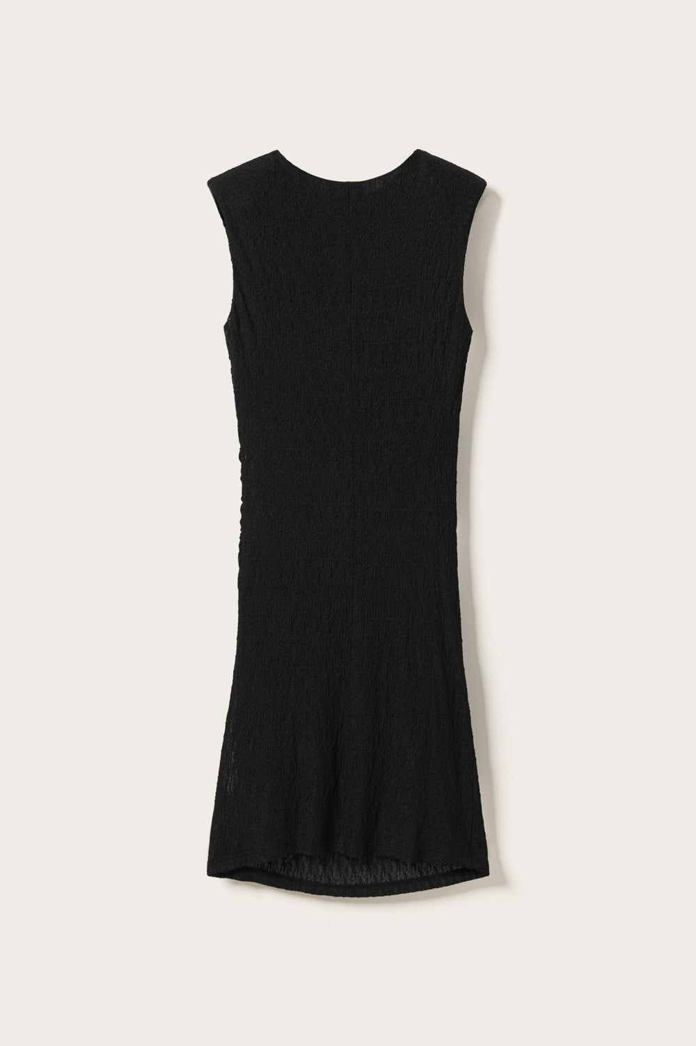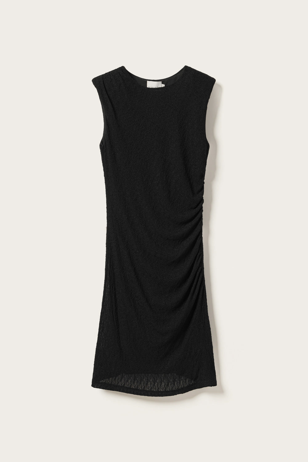 Lachina Dress is a short, sleeveless dress crafted in delicate lace with subtle ruching at the shoulders and side seams. Its tailored silhouette gently skims the body, creating a feminine shape. Pair with boots for a modern, edgy vibe or heels for a classic, elegant look.