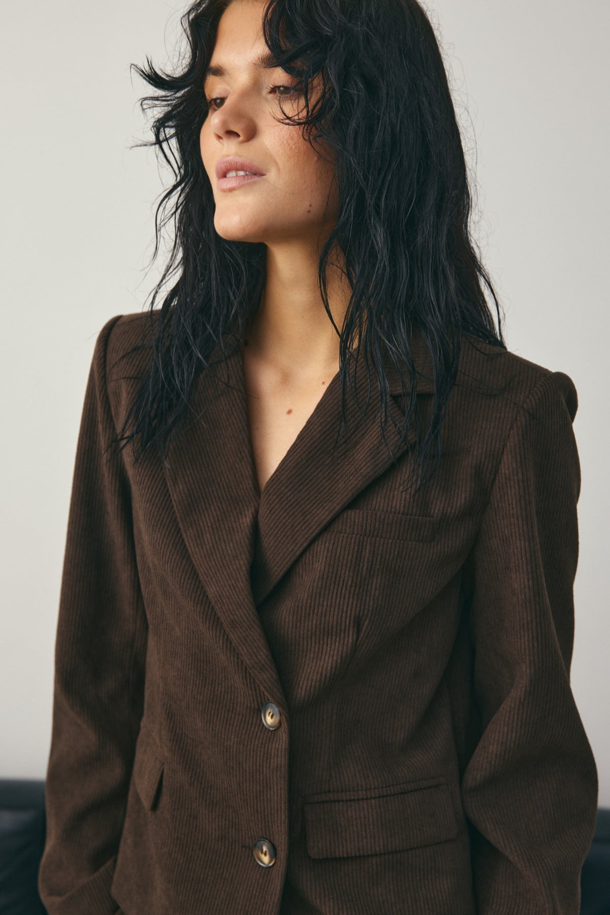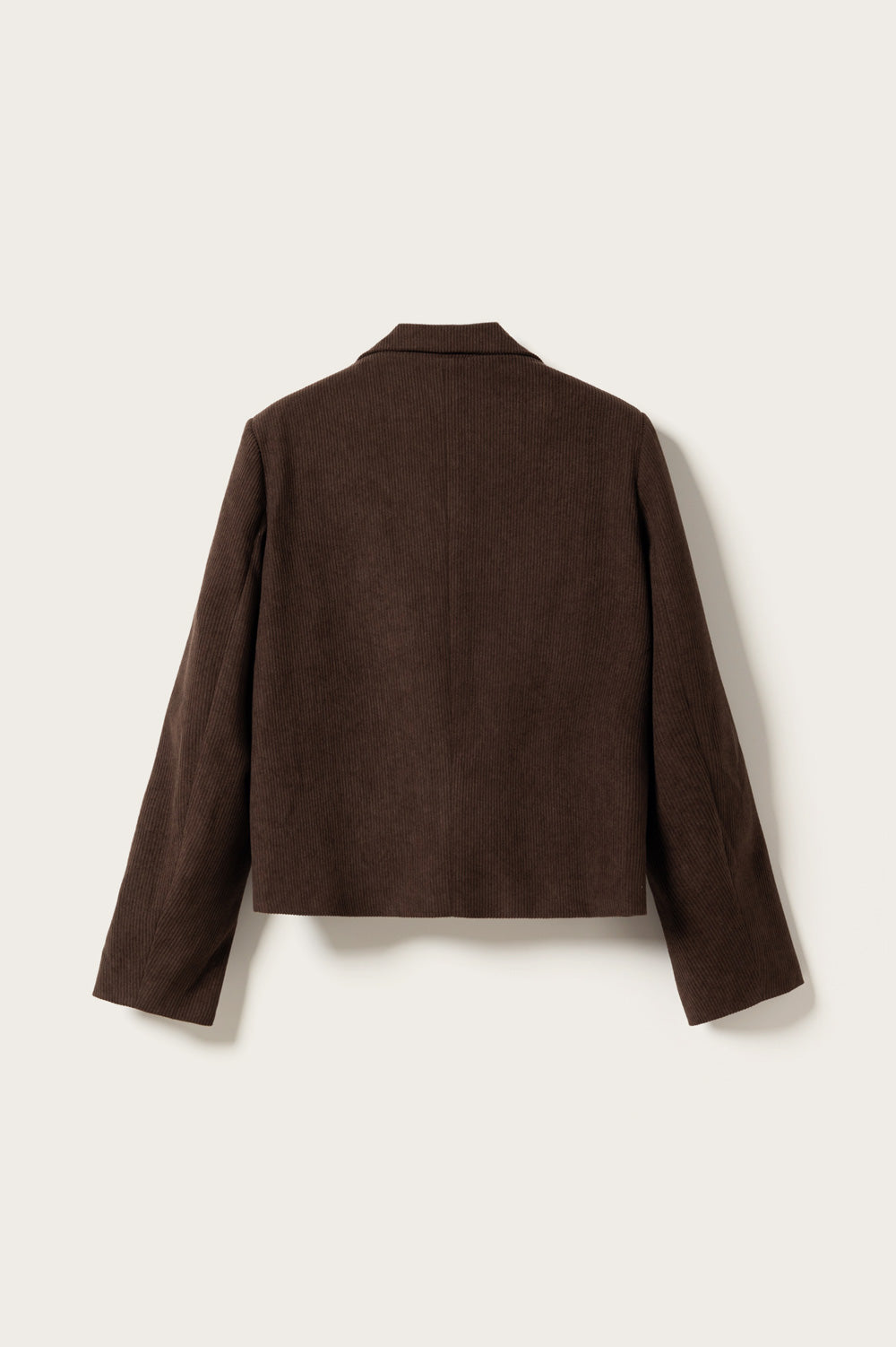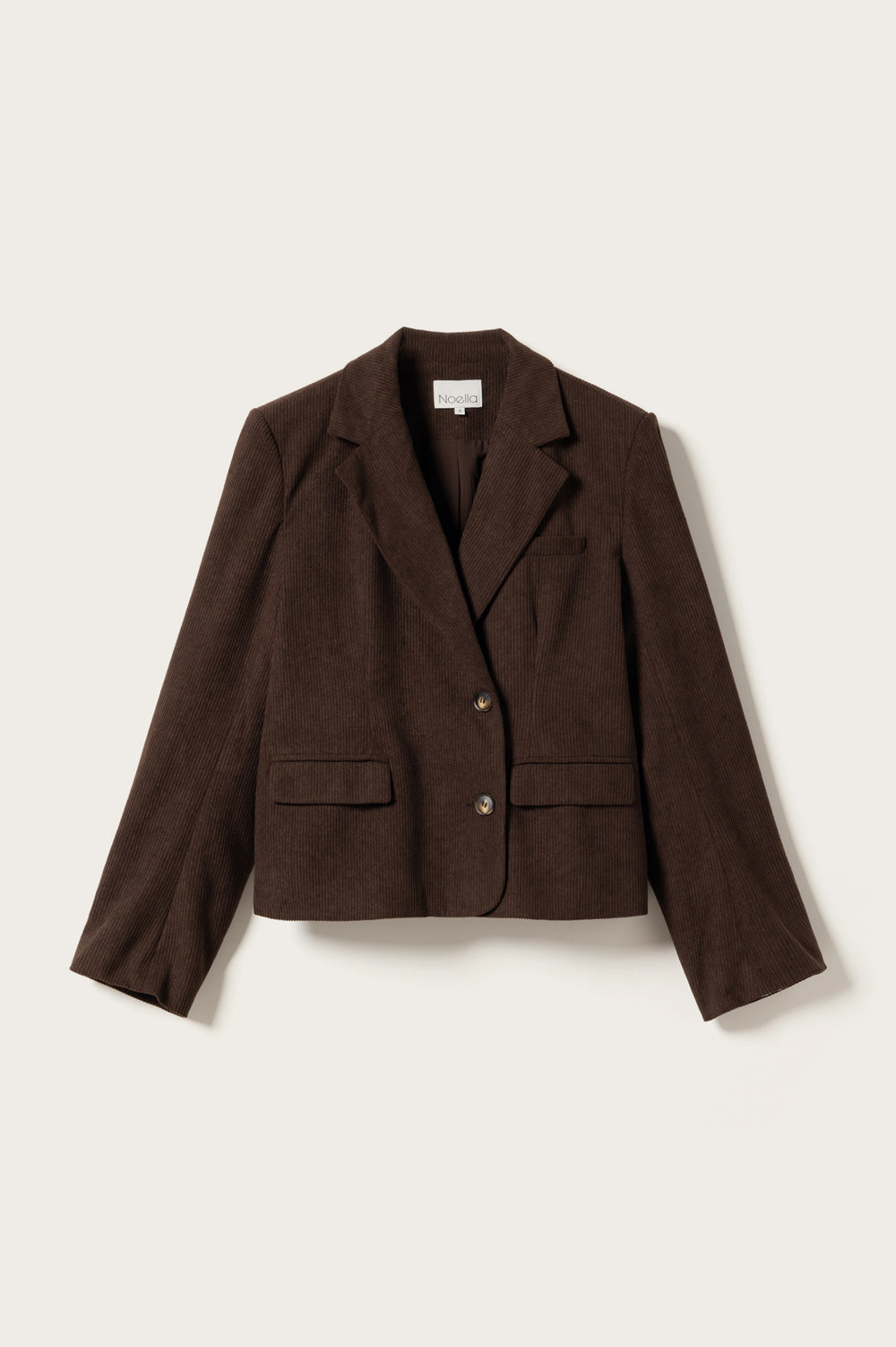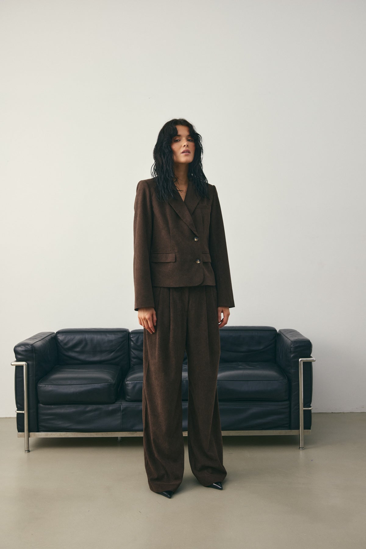 Laur Blazer is a cropped blazer featuring an asymmetric cut and classic velvet texture. Pair with Lusia Pants in the same fabric for a polished coordinated set, or style with jeans for a contemporary everyday look.