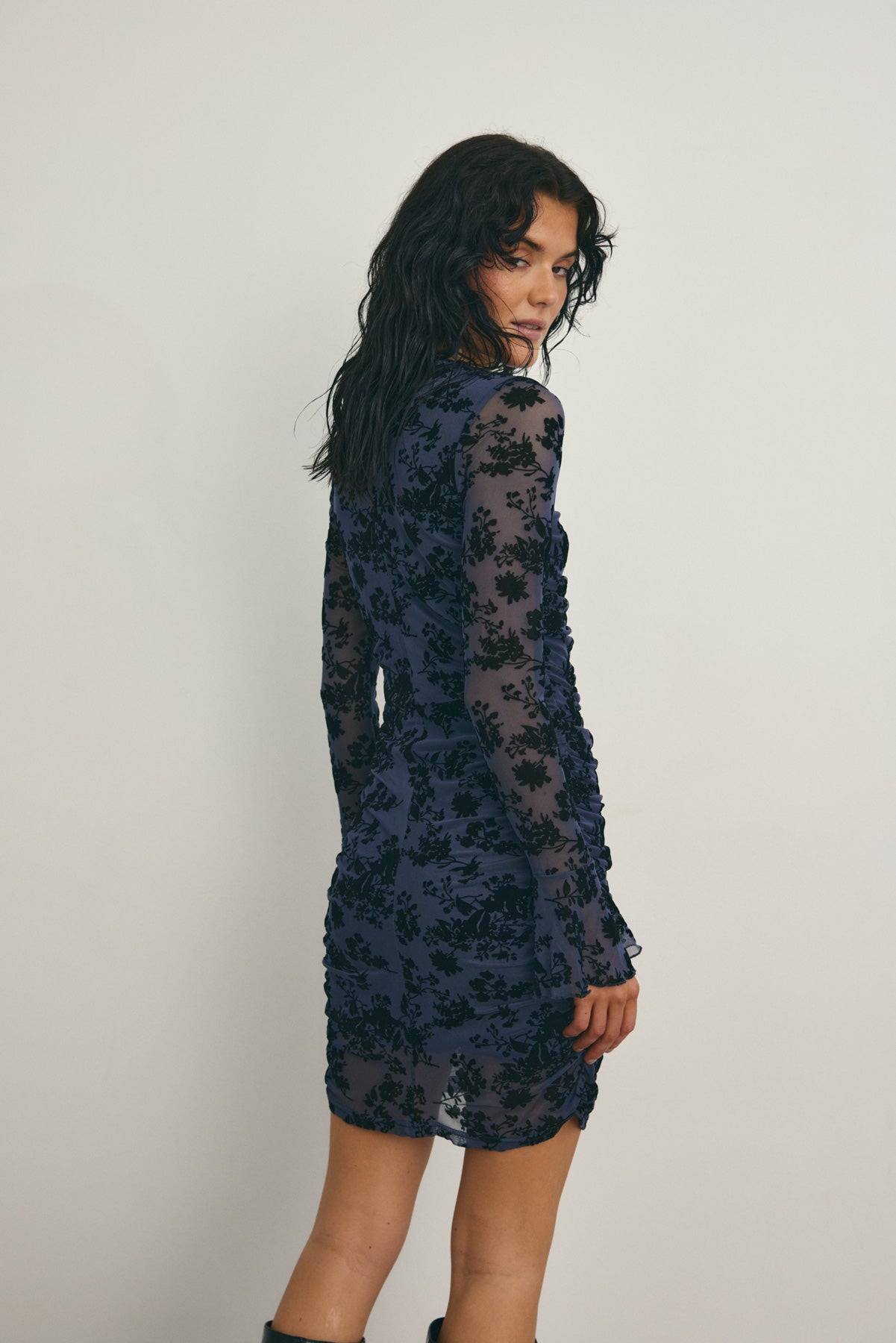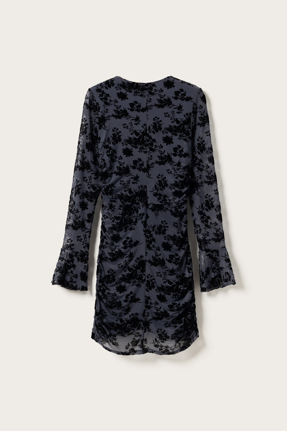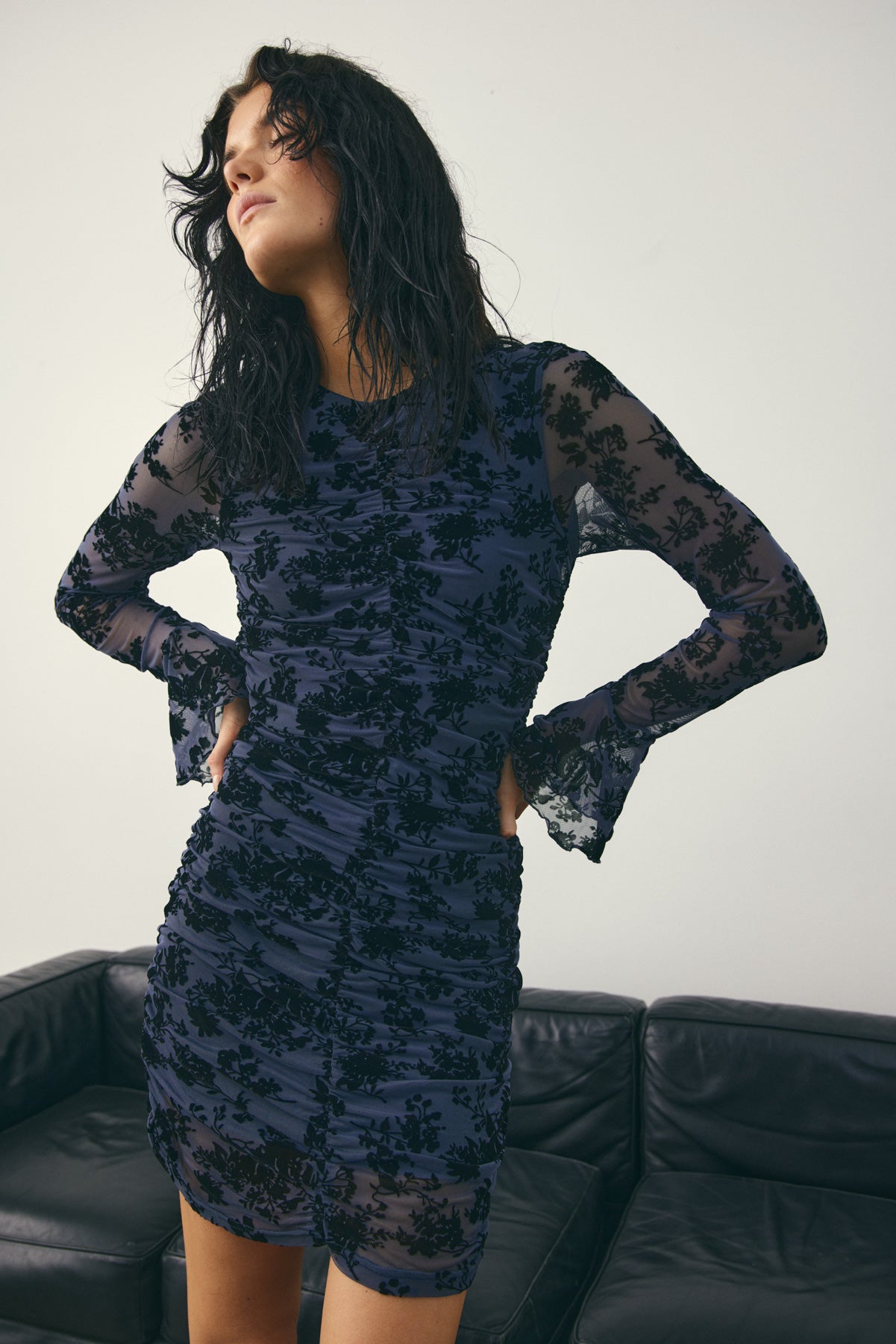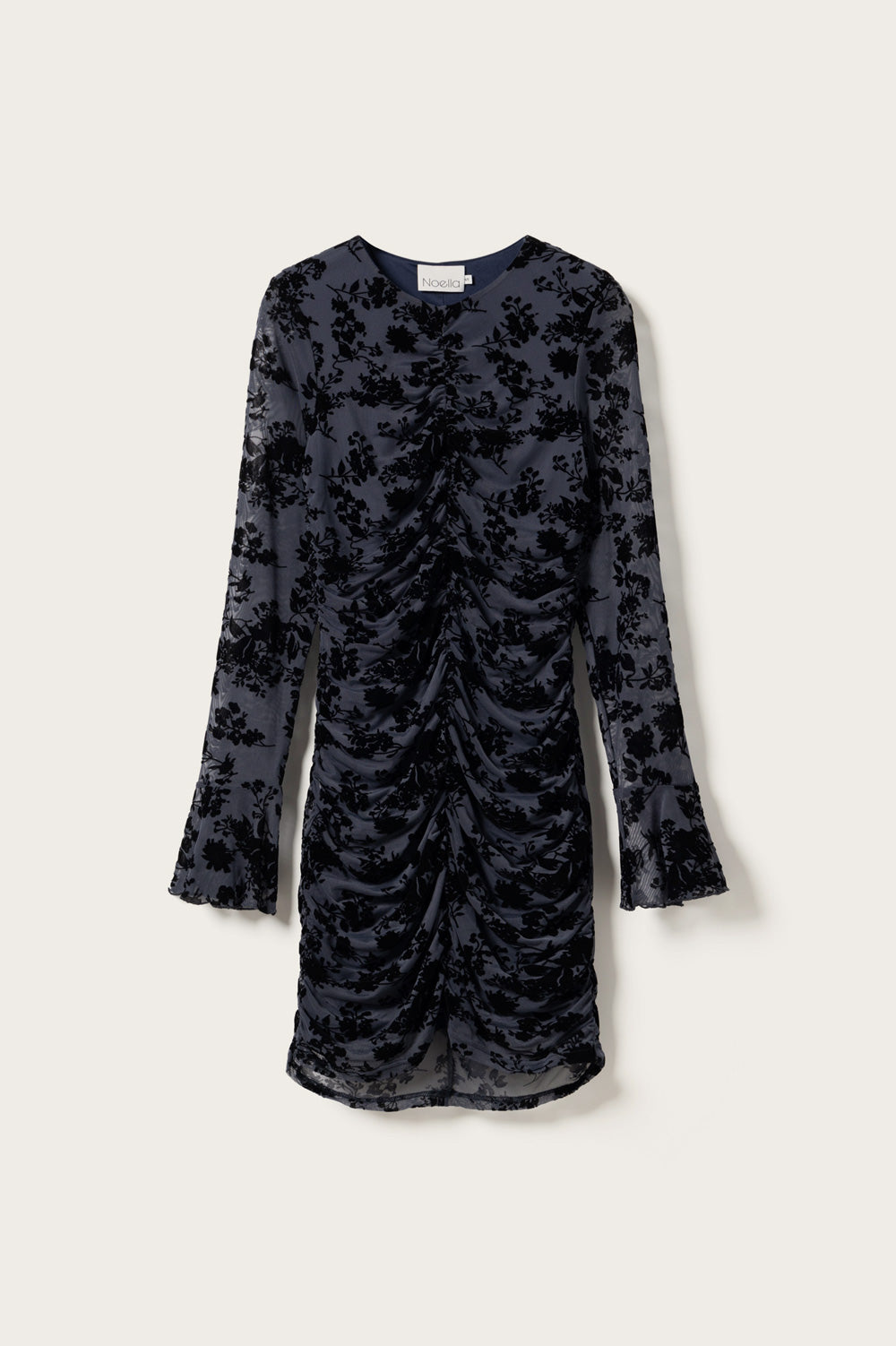 Lavetta Dress is a tailored dress with ruched details along the body, wide cuffs, and integrated floral print in the fabric.