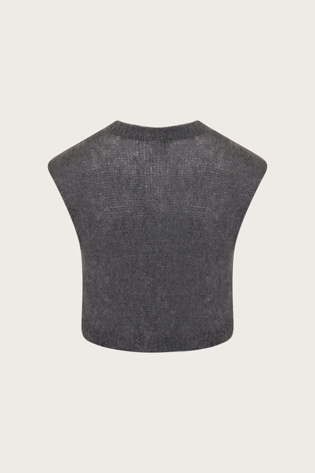 Lelia Knit is a slipover knit vest without sleeves, featuring a round neckline and a loose fit.