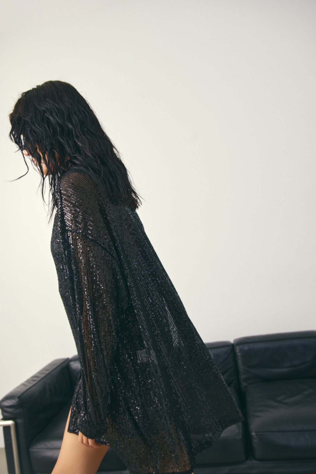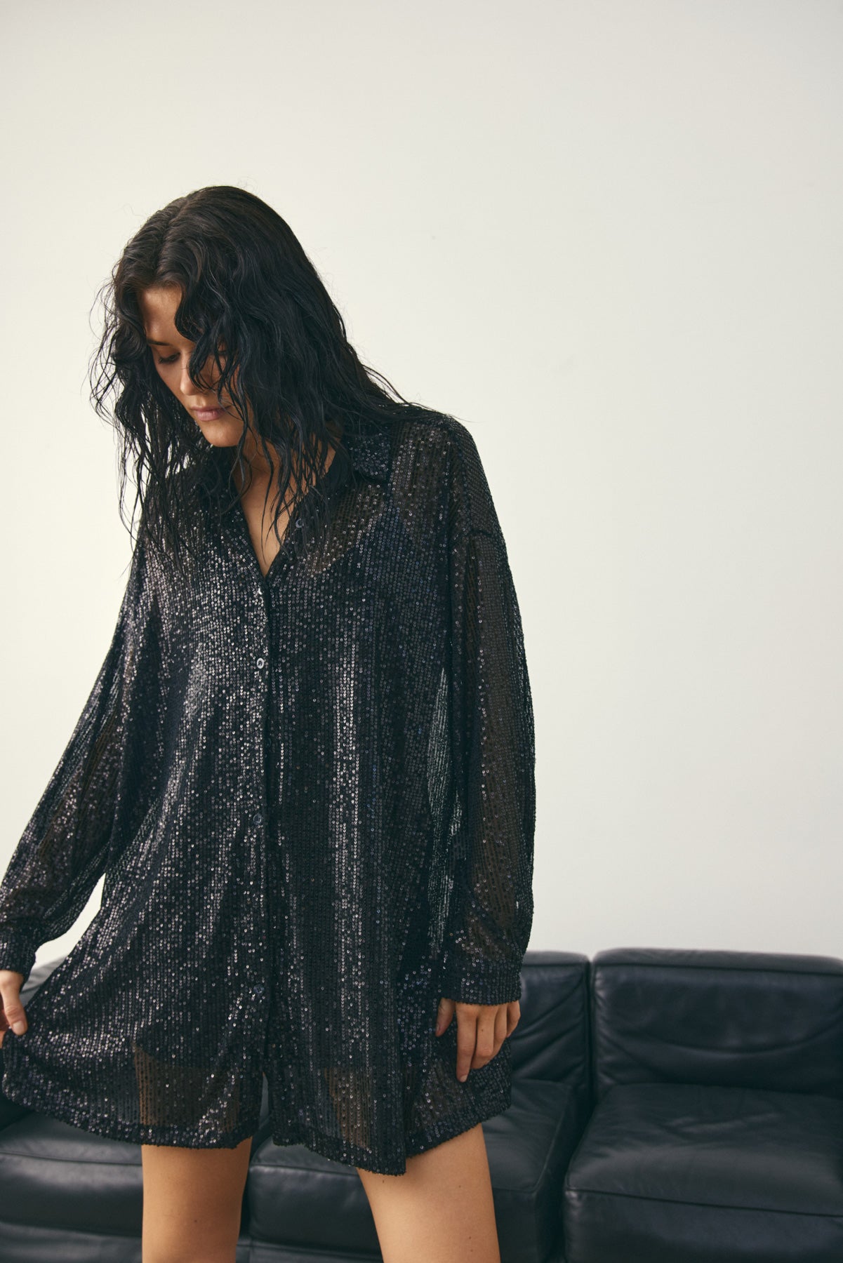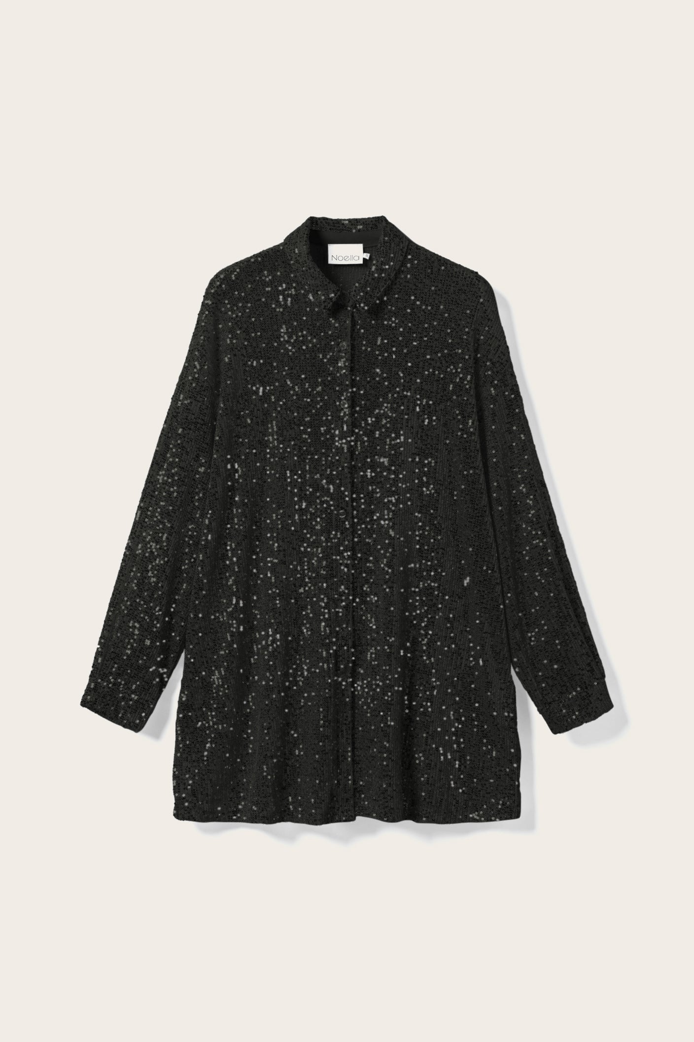Lizanne Shirt is a sequin shirt with long sleeves, a classic collar, button closure, and a loose fit.