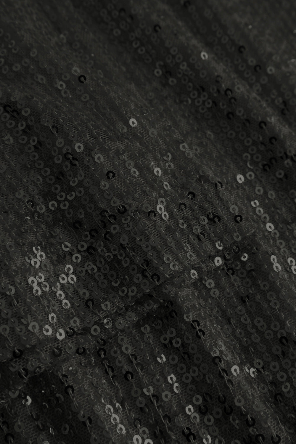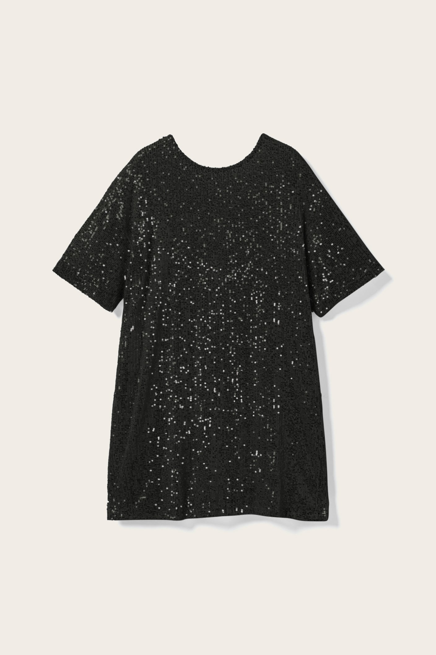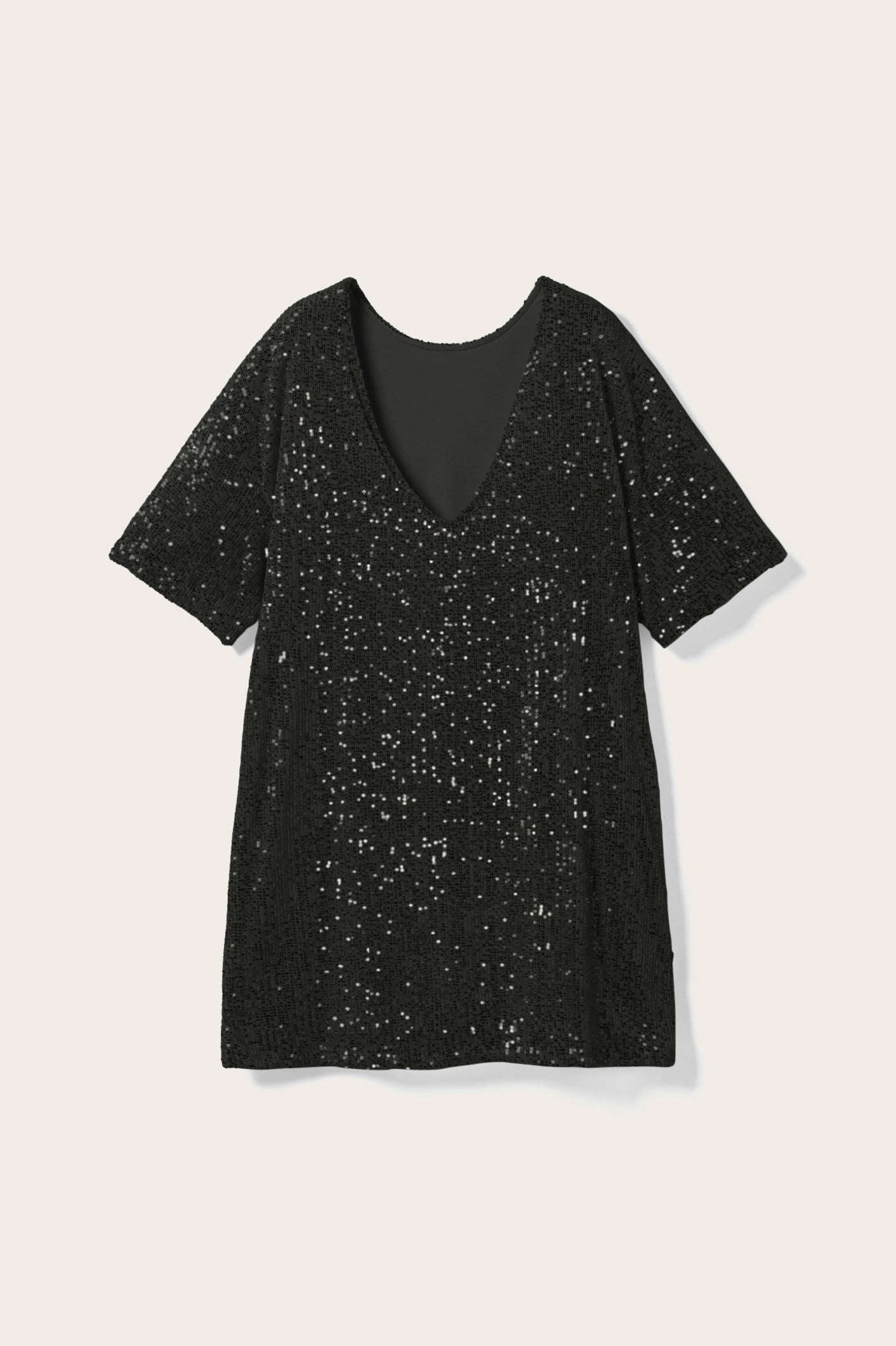Lorah Dress is a T-shirt style dress with a loose fit, short sleeves, sequins, and a V-back neckline.