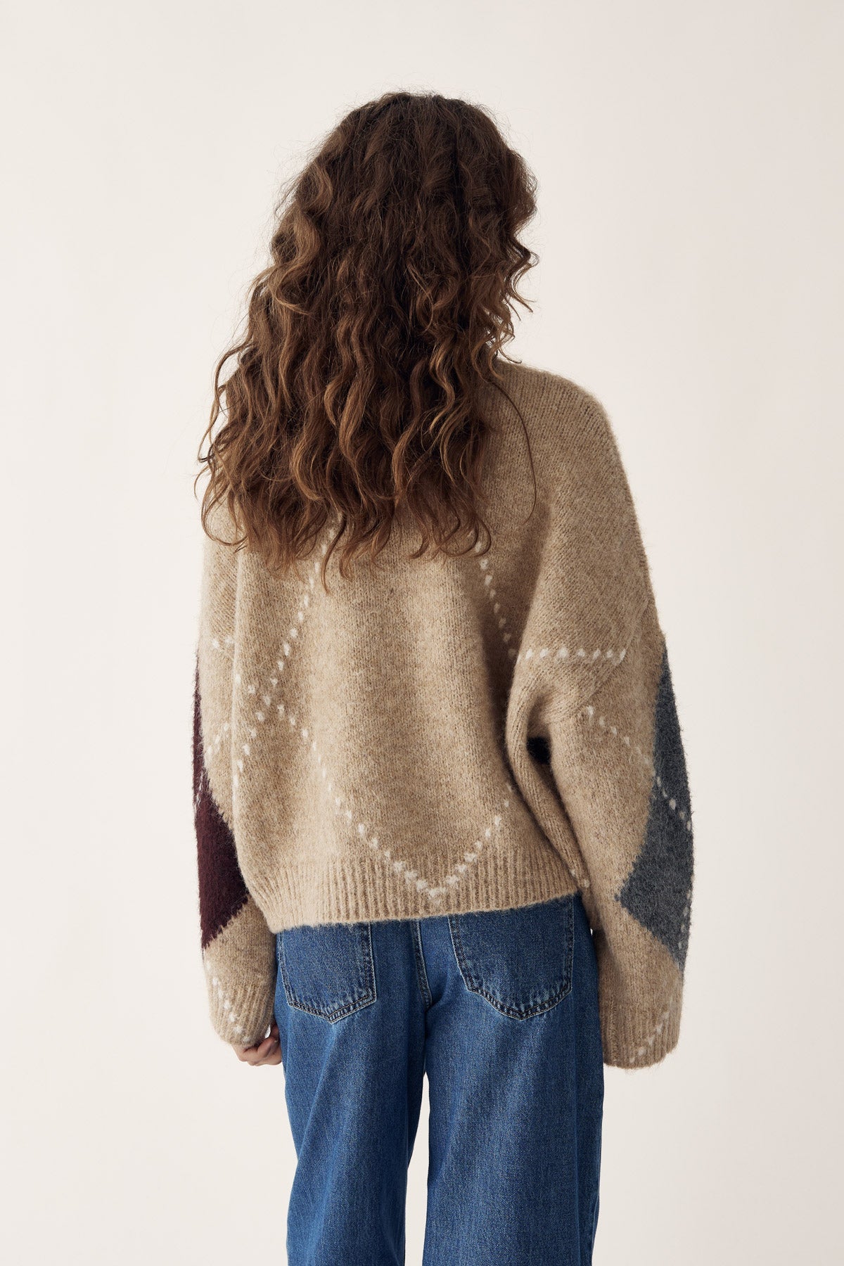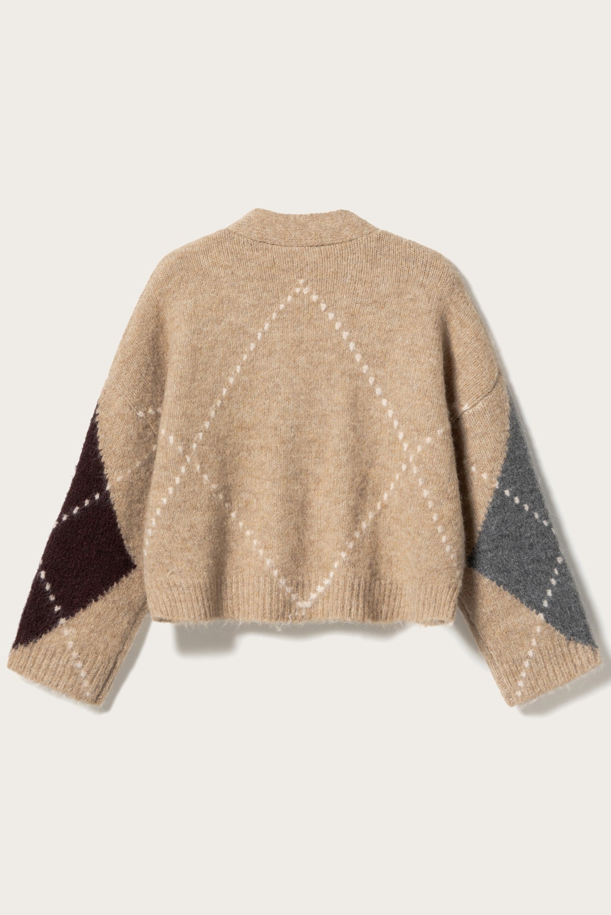 N-Laiana Knit Cardigan is an oversized cardigan with a classic Argyle-pattern. N-Laiana Knit Cardigan is designed with a relaxed fit, long voluminous sleeves, and a slightly cropped length. The argyle design adds a timeless and elevated touch, making it perfect for autumn styling. A must-have in the wardrobe.