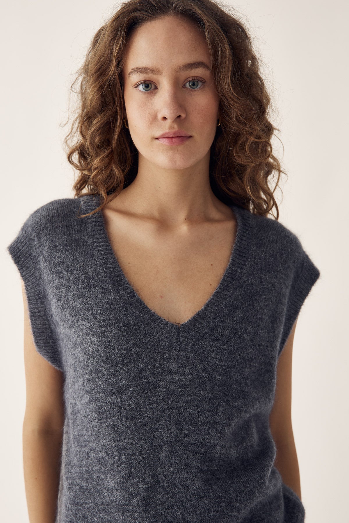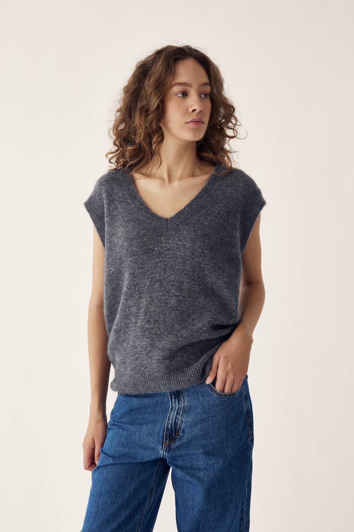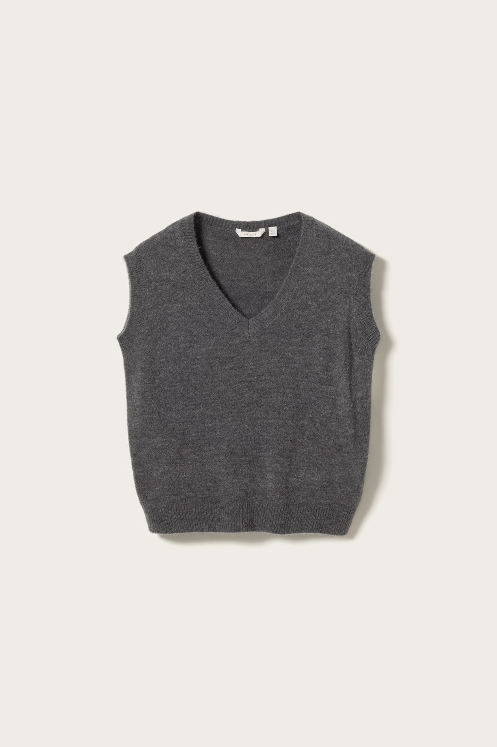 N-Leatrice Knit Vest is a V-neck knit vest with a soft texture and relaxed fit. It offers a comfortable, laid-back look and can be styled under a blazer or layered with a shirt underneath.