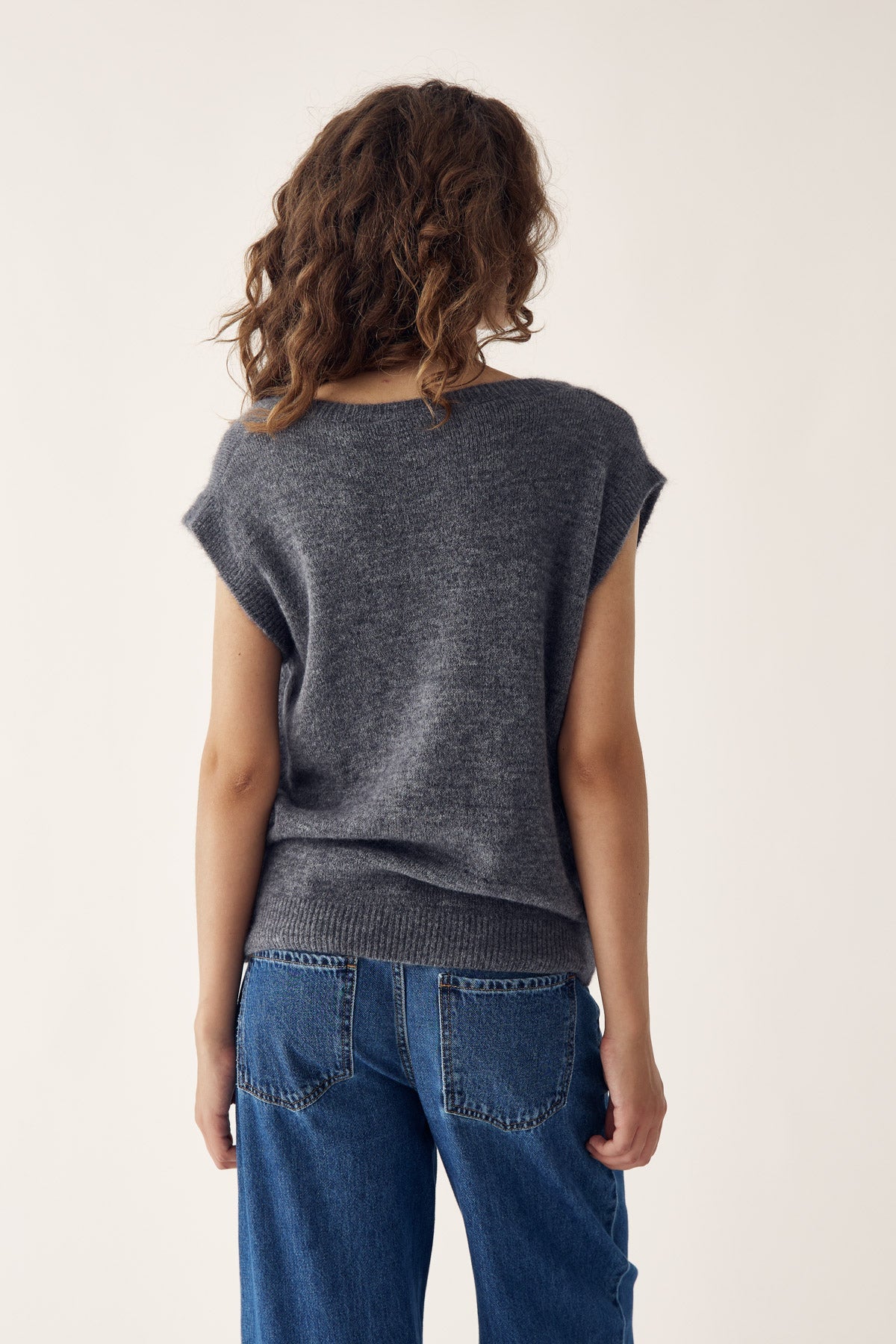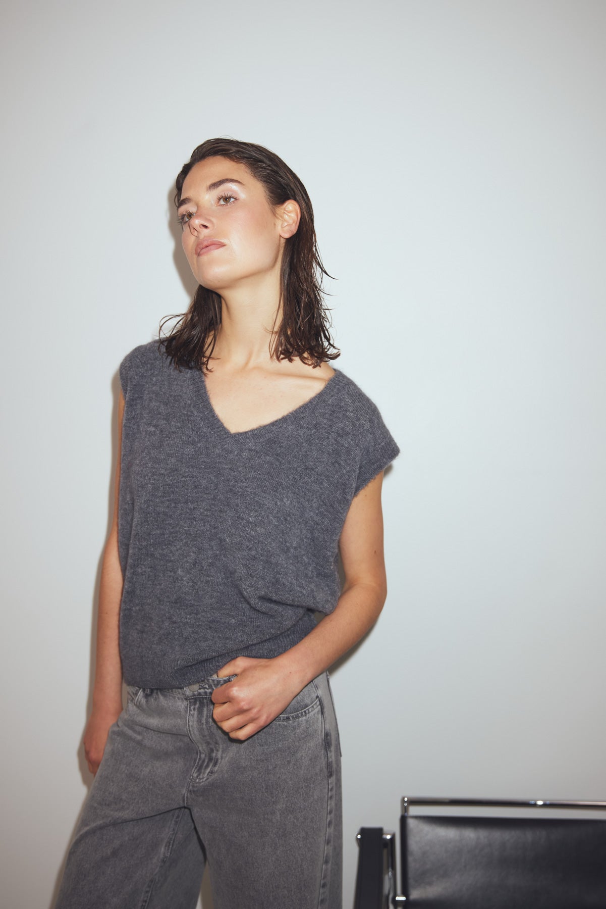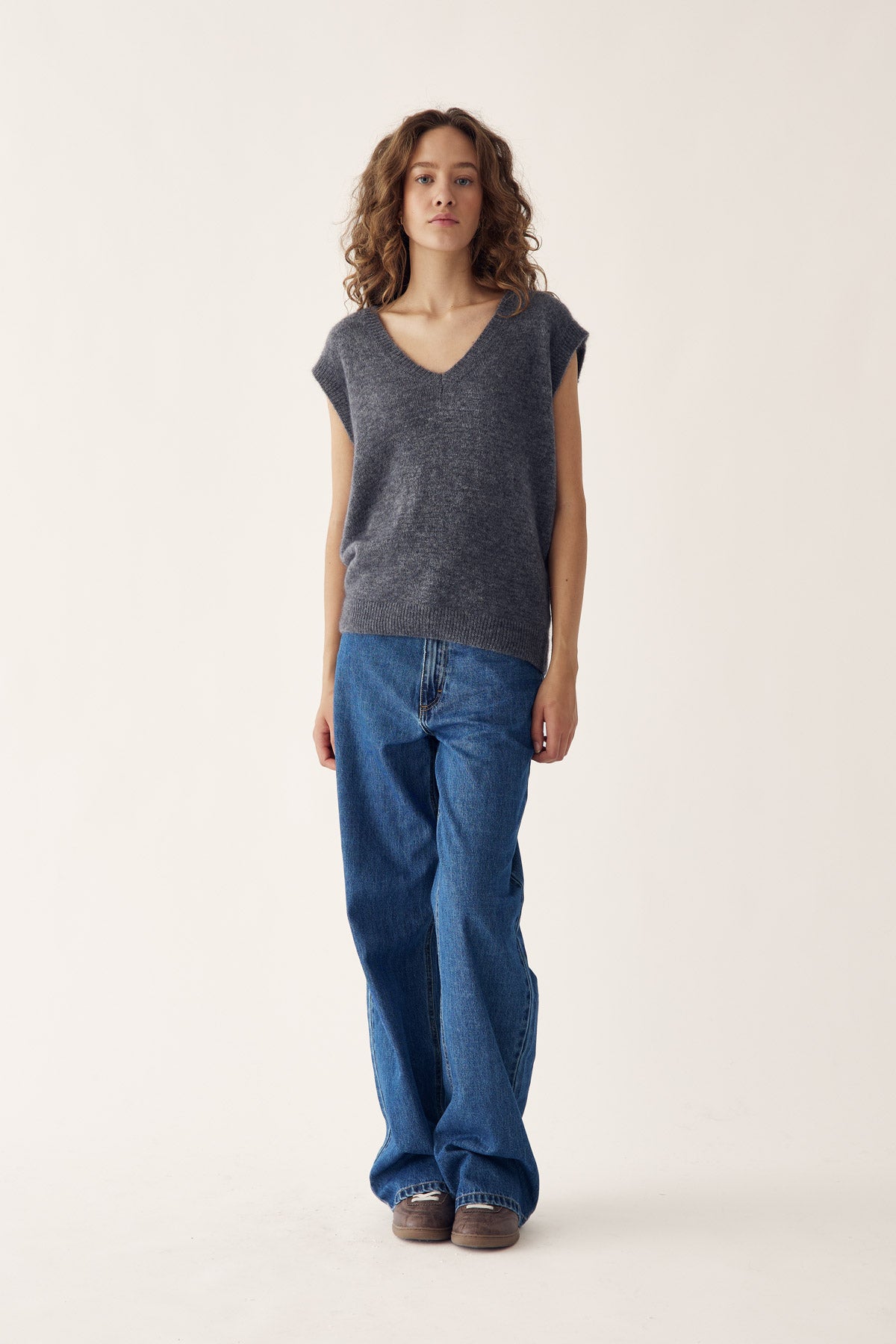 N-Leatrice Knit Vest is a V-neck knit vest with a soft texture and relaxed fit. It offers a comfortable, laid-back look and can be styled under a blazer or layered with a shirt underneath.