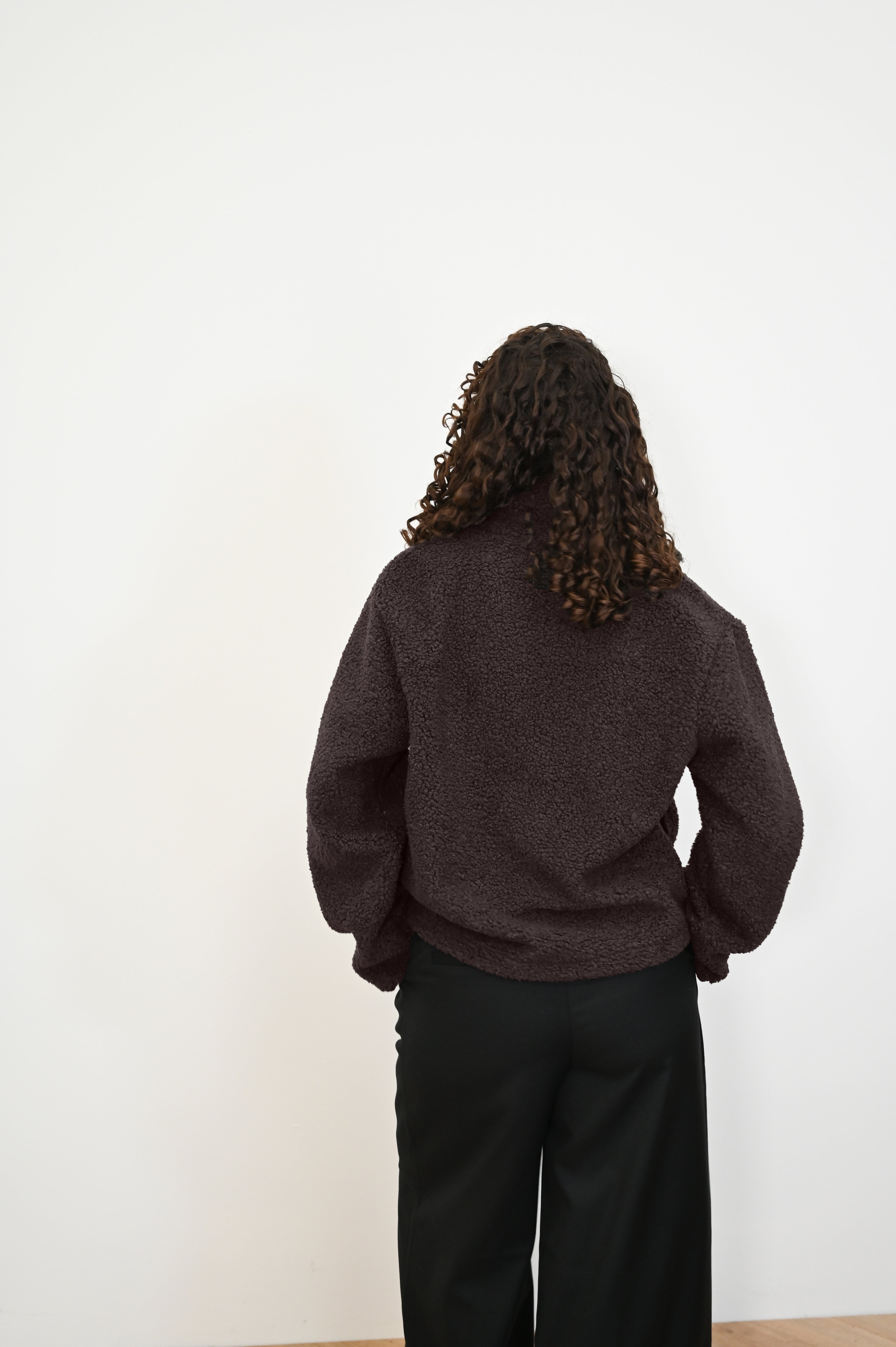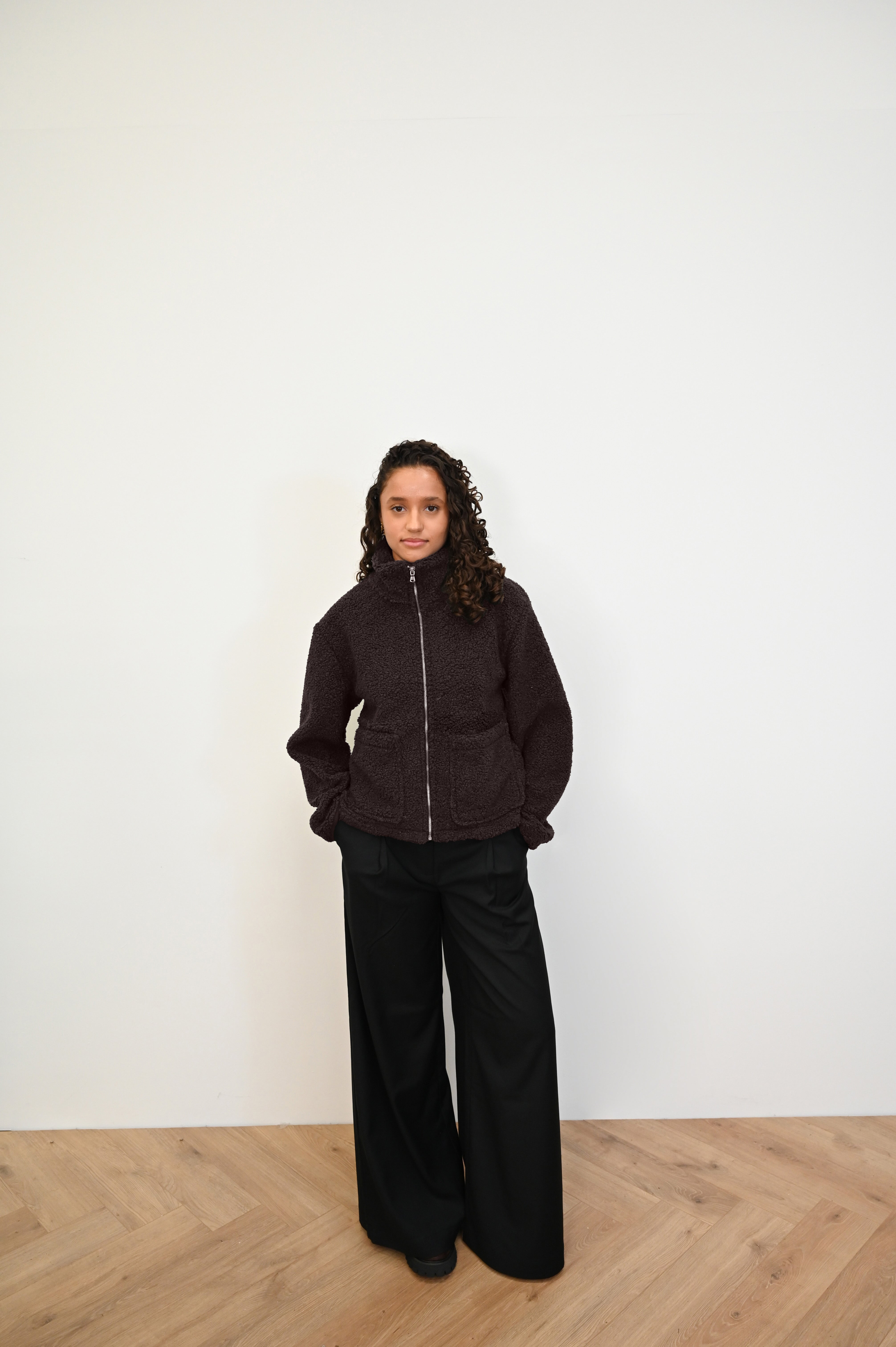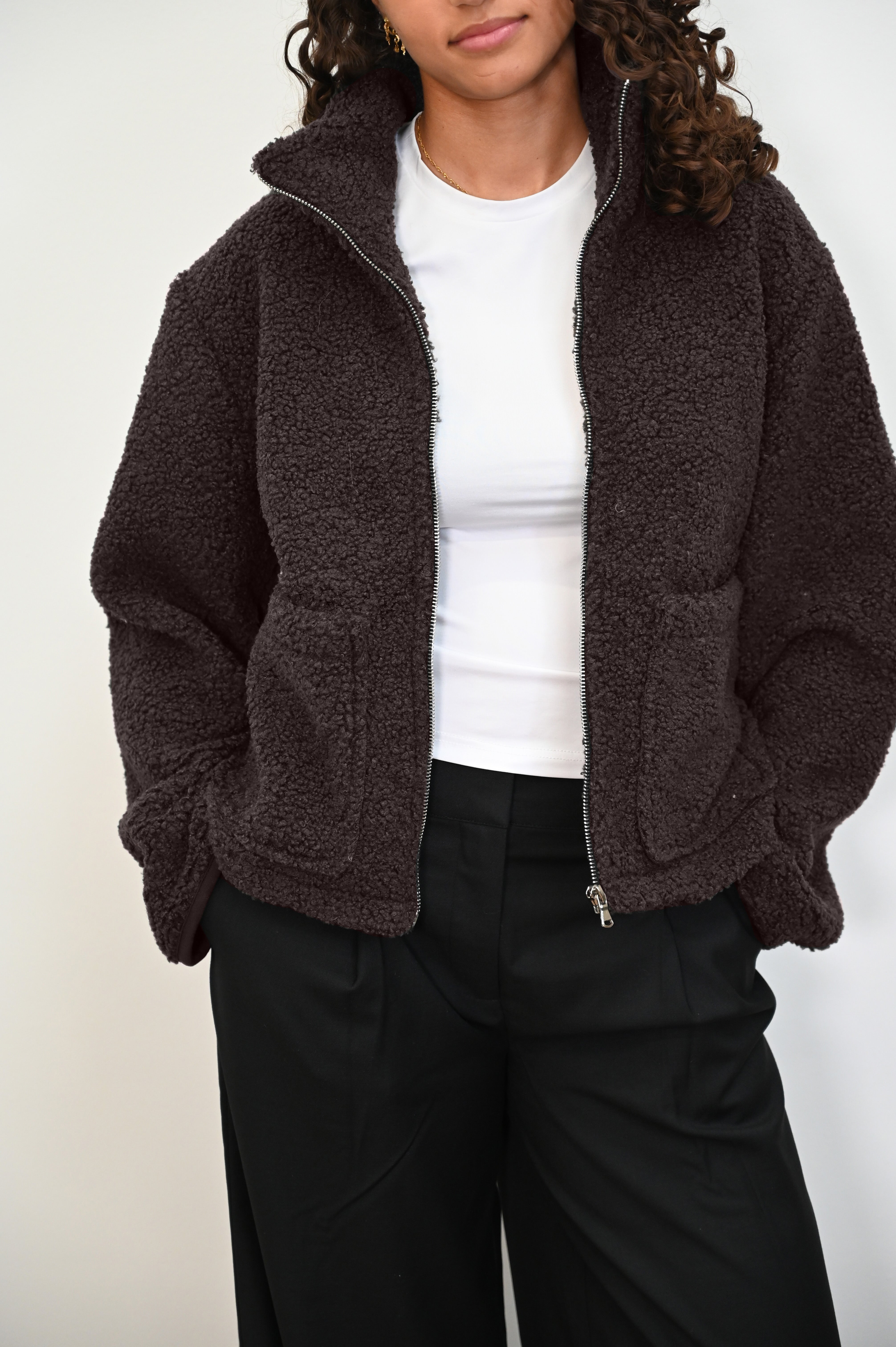 N-Madi Jacket is a short style made from soft teddy fabric. Designed with a high neck, big front pockets and a zipper, it offers both warmth and versatility.