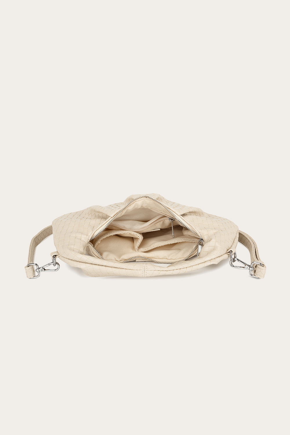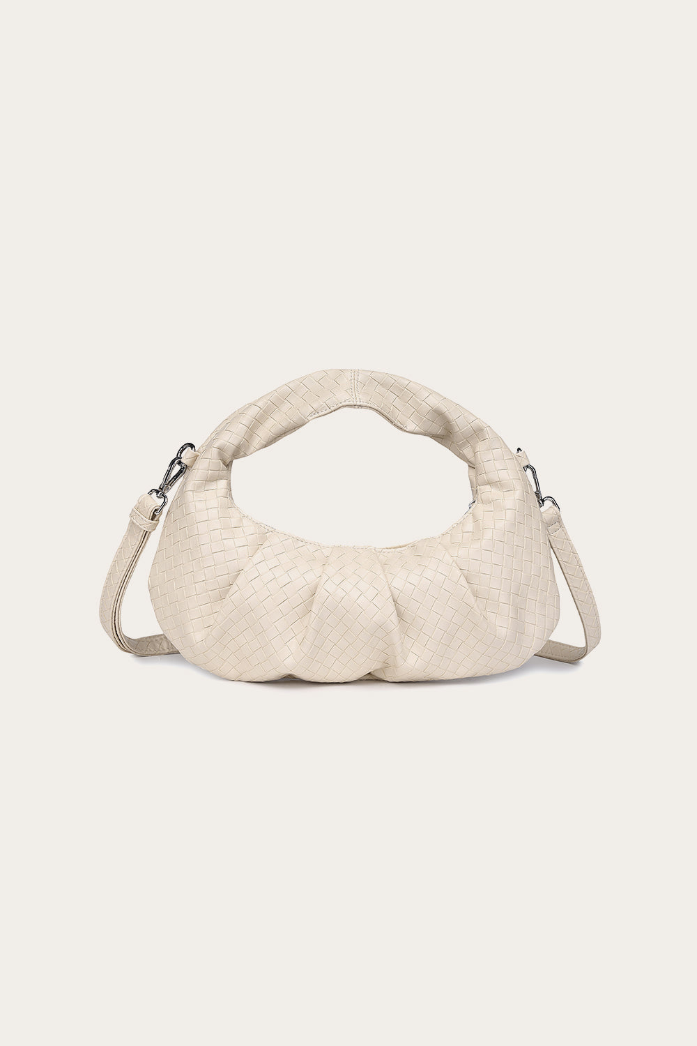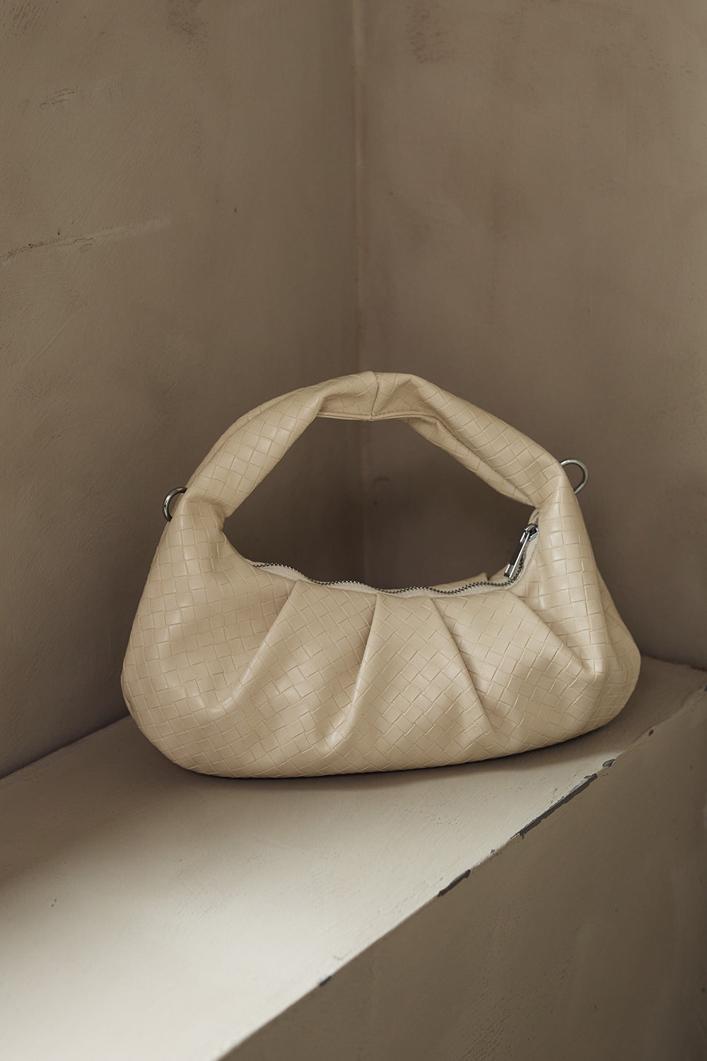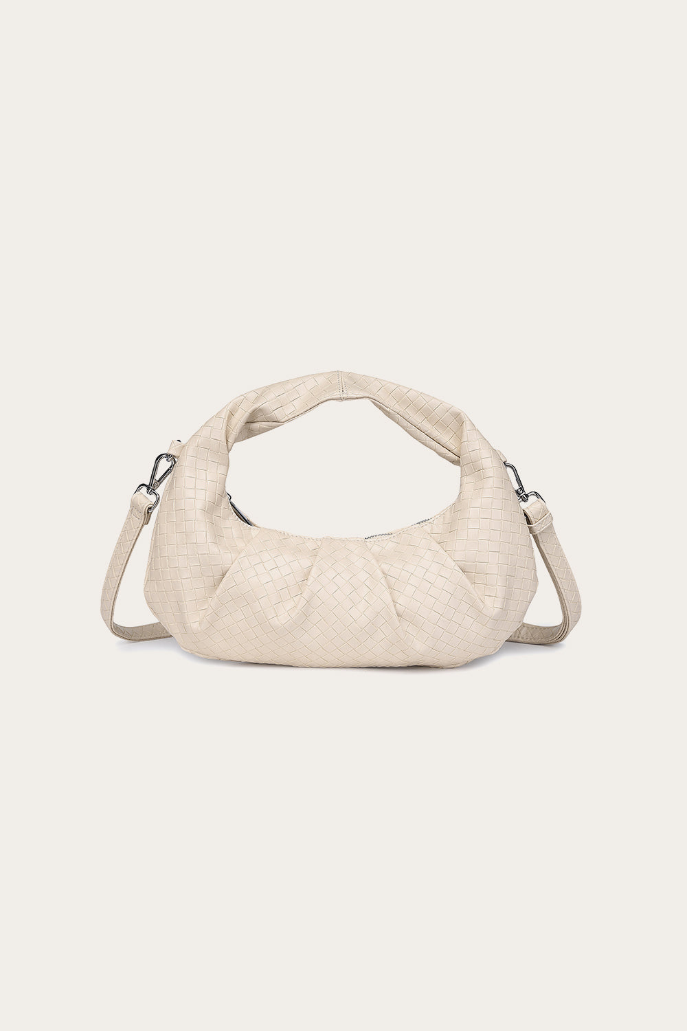 Sula Faye Bag has small square patterns in the design. Each side features a strap where a longer strap can be attached. It closes with a zipper and has an inner pocket.